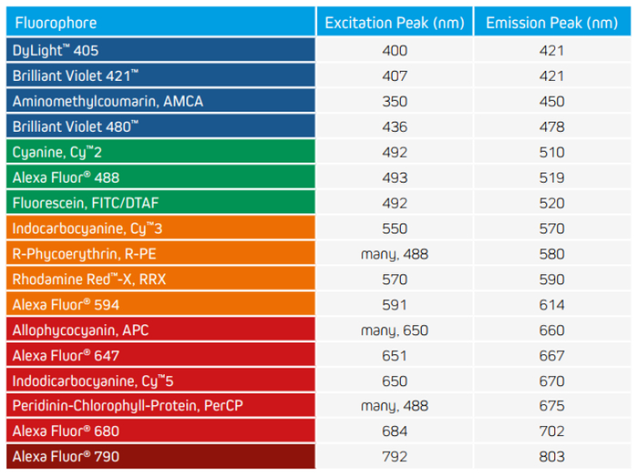 常用的荧光基团,如异硫氰酸荧光素(FITC),Rhodamine Red- X(RRX),四甲基罗丹明(TRITC)和氨基甲基香豆素醋酸酯(AMCA),Alexa Fluor,DyLight,Cyanine(Cy)和Brilliant Violet等。此外,荧光蛋白R-phycoerythrin (R-PE)、Allophycocyanin (APC)和Peridinin-Chlorophyll-Protein (PerCP)也可用于特定的应用,如流式实验。荧光基团被不断扩充和设计以用来填补现有基团之间的光谱空白,以便于研究人员可以同时检测更多的指标。另一些则为了与光谱细胞术兼容,这种技术可同时检测40个以上的靶标。