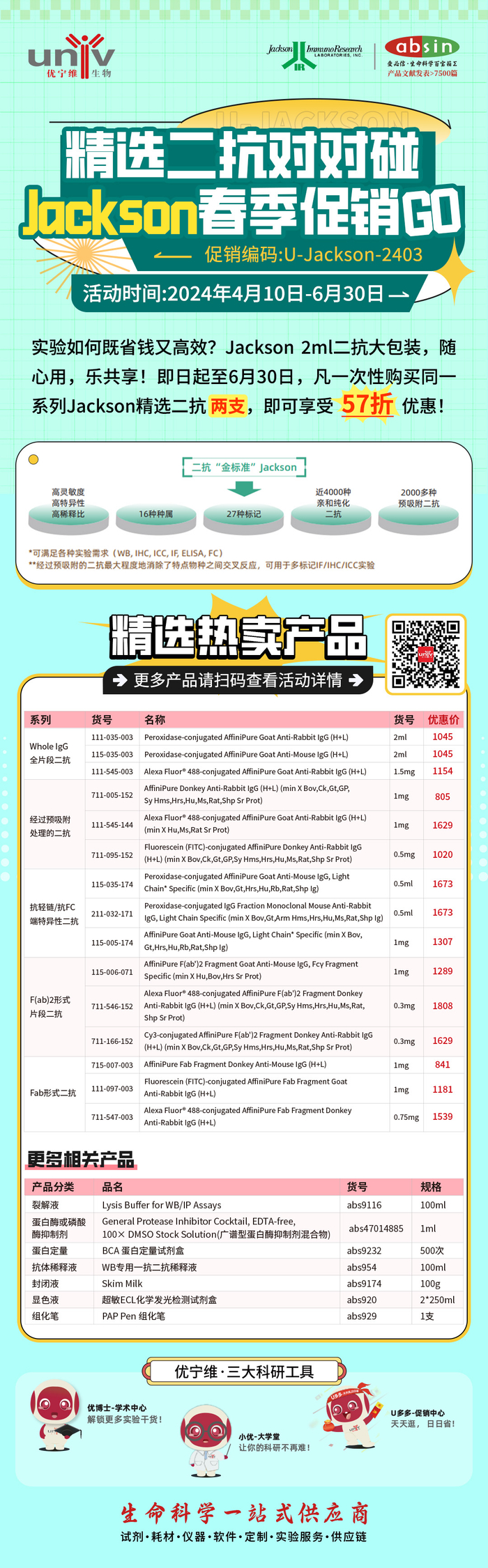 Jackson ImmunoResearch Inc.(JIR)是世界著名二抗生产商,致力于生产亲和纯化的二抗金标准品牌。