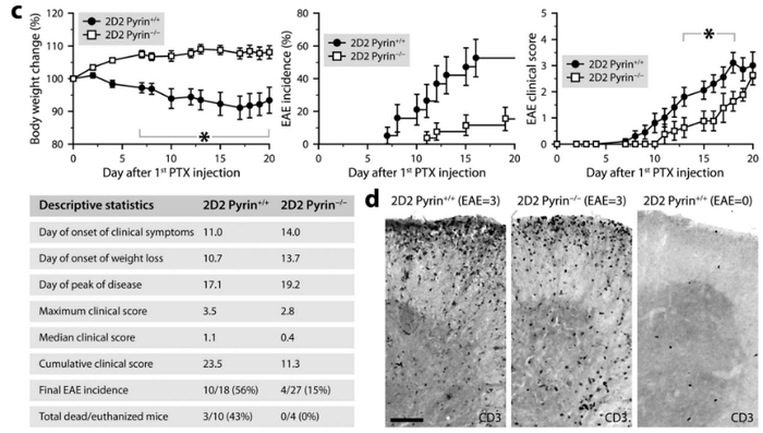 在没有pyrin的情况下,PTX不会诱导中性粒细胞与大脑毛细血管的黏附,并且在诱导具有脑源性T淋巴细胞小鼠的EAE方面效果较差。该研究确定了激活pyrin的第一个微生物分子PTX,感染后可能影响MS的机制,也是免疫疾病的潜在治疗靶点。