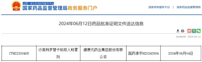 近日(6月12日),据国家药监局官网显示,健康元药业集团的沙美特罗替卡松吸入粉雾剂获批上市并视同过评,为国内首仿。