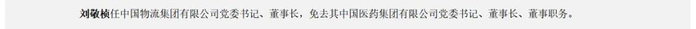 刘敬桢任中国物流集团有限公司党委书记、董事长,免去其中国医药集团有限公司党委书记、董事长、董事职务。