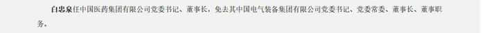 其中,白忠泉任中国医药集团有限公司党委书记、董事长,免去其中国电气装备集团有限公司党委书记、党委常委、董事长、董事职务。