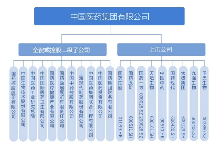 以国药为例,其下有9家上市公司:国药控股、国药股份、国药一致、天坛生物、中国中药、国药现代、太极集团、九强生物、卫光生物,分别在血制品、中药等方面占有重要市场,太极集团、卫光生物均是其通过收并购取得。