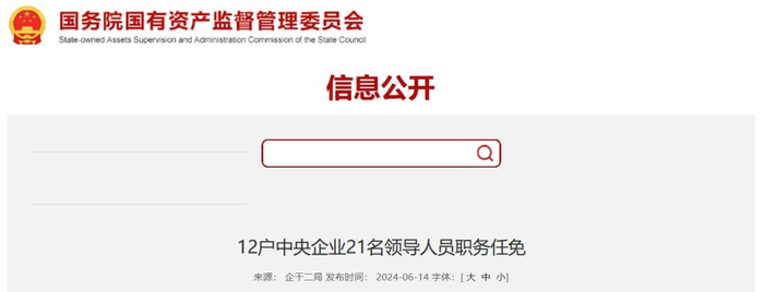 6月14日,国务院国有资产监督管理委员会官网公布了12户中央企业21名领导人员职务任免。