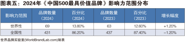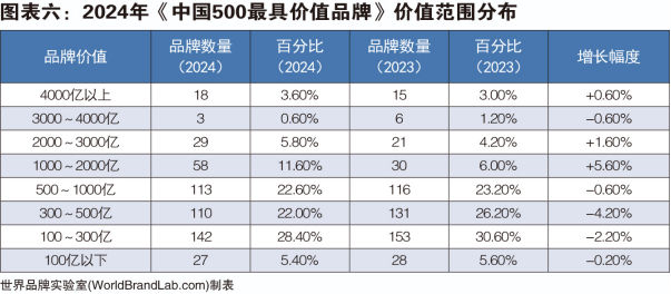 据了解,本年度《中国500最具价值品牌》排行榜中,共有来自食品饮料、轻工业、建材、传媒、纺织服装、医药、机械等在内的24个相关行业的品牌入选。其中食品饮料业依然是入选品牌最多的行业,共有80个品牌入选,占总入选品牌数的16.00%;入选数量位居第二到第五的行业分别是轻工(41个)、通信电子IT(39个)、建材(36个)、传媒(32个)。在衡量品牌的忠诚度时,世界品牌实验室参考了我信品牌(iTrust Rating)的评级数据;在衡量品牌的领导力特别是ESG(环境、社会和治理)评分时,参考了超级财经(SuperFinance)的ESG数据库。同时还借用了低碳国际(Carboncare International)对品牌企业碳排放的计量,以推动品牌添加“碳排放评分”标签。