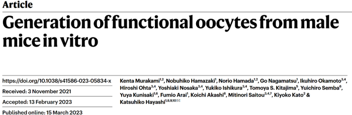 尽管同性基因可以得以遗传,但不论怎么说,同性之间即使是真爱,想要繁衍后代,还是需要通过异性。但是,传统认知也是可以被现代科学颠覆的!这不,在Nature的一篇报道中,自然生殖中的性别限制被解开,科学家在体外将雄性小鼠的诱导多能干细胞(iPSCs)转化为功能性卵细胞,进而通过这些卵细胞产生双父系后代。该研究由Kenta Murakami等人发表,题为Generation of functional oocytes from male mice in vitro。
