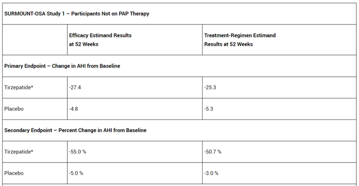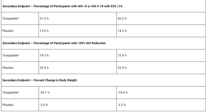 [1] Lilly's tirzepatide reducedobstructive sleep apnea (OSA) severity, with up to 51.5% of participants meetingthe criteria for disease resolution. Retrieved June 24, 2024 from https://investor.lilly.com/news-releases/news-release-details/lillys-tirzepatide-reduced-obstructive-sleep-apnea-osa-severity