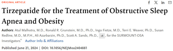[2] MalhotraA, Grunstein RR, Fietze I, Weaver TE, Redline S, Azarbarzin A, Sands SA, SchwabRJ, Dunn JP, Chakladar S, Bunck MC, Bednarik J; SURMOUNT-OSA Investigators.Tirzepatide for the Treatment of Obstructive Sleep Apnea and Obesity. N Engl JMed. 2024 Jun 21. doi: 10.1056/NEJMoa2404881. Epub ahead of print. PMID:38912654.