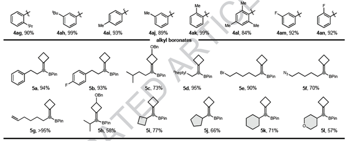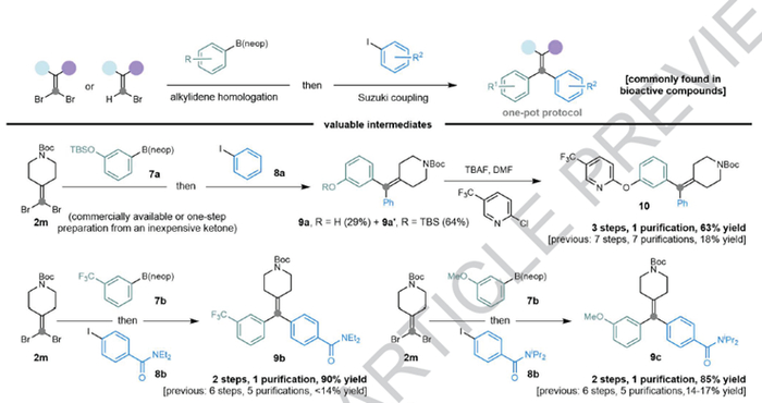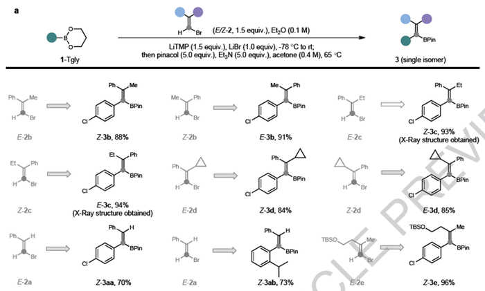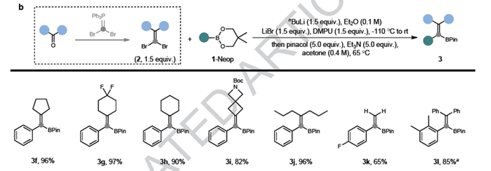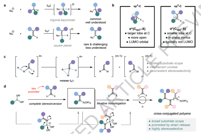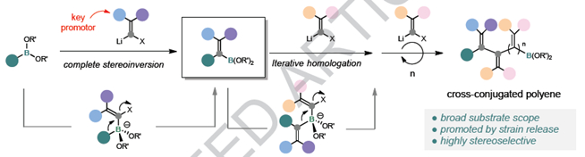 Prof. Guangbin Dong and his co-workers have developed ageneral, efficient, and stereospecific alkenylidene homologation method, enabled by a distinct strain-release-enhanced metallate SNV mechanism. Thereaction tolerates various functional groups, as well as steric and electronicvariations in substrates. The excellent stereospecificity ofthis reaction makes it suitable for modular construction of tetrasubstituted alkenes, commonly found in complex bioactive compounds yet nontrivial toprepare efficiently. Iterative alkenylidenehomologation offers a route to the fully-substituted cross-conjugated polyenes,which are intriguing but hard-to-access structural motifs. The mechanisticinsights gained from the computational studies are expected to provide betterunderstandings of SNV reactions and further implications ondeveloping synthetically useful homologation methods.
