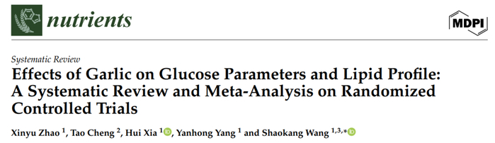 最近,来自东南大学的一项研究表明,食用大蒜有助于改善身体血红蛋白、总胆固醇、低密度脂蛋白等多项健康指标,相关研究以“Effects of Garlic on Glucose Parameters and Lipid Profile: A Systematic Review and Meta-Analysis on Randomized Controlled Trials”为题发表在《Nutrients》上。