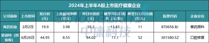 今年上半年,A股上市的两家医药医疗类企业分别为从事兽药生产销售的海昇药业、专注口腔器械的爱迪特,募资净额分别为3.98亿元、8.55亿元。