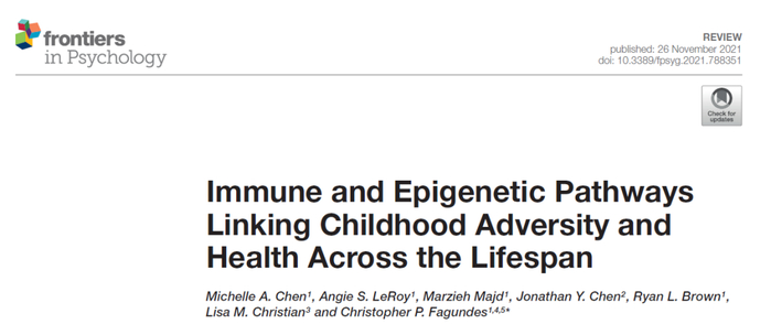 [2] Chen MA, LeRoy AS, Majd M, Chen JY, Brown RL, Christian LM, Fagundes CP. Immune and Epigenetic Pathways Linking Childhood Adversity and Health Across the Lifespan. Front Psychol. 2021 Nov 26;12:788351. doi: 10.3389/fpsyg.2021.788351