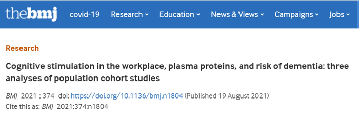 2. Kivimäki M, Walker K A, Pentti J, Nyberg S T, Mars N, Vahtera J et al. Cognitive stimulation in the workplace, plasma proteins, and risk of dementia: three analyses of population cohort studies BMJ 2021; 374 :n1804 doi:10.1136/bmj.n1804