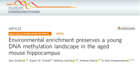 在2021年的时候,德国德累斯顿技术大学的研究团队在《自然·通讯》上发过一篇叫做“Environmental enrichment preserves a young DNA methylation landscape in the aged mouse hippocampus”的文章。他们发现,给老年老鼠的海马体(大脑里负责学习和记忆的重要部位)提供丰富的环境刺激,能让它们的DNA甲基化模式保持年轻状态,这为对抗与年龄相关的认知衰退提供了新的思路。这项研究揭示了丰富的环境影响大脑老化的分子机制。