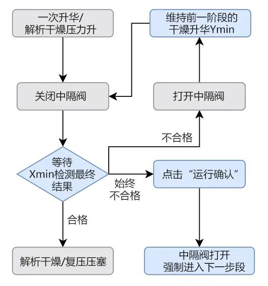 如果超过设定值,则表示压力升测试失败,程序将会保持当下的真空与温度,打开中隔阀,继续进行干燥。