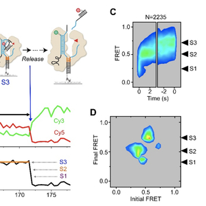 利用供体(Cy3)标记的sgRNA和受体(Cy5)标记的DNA,研究者通过单分子FRET实验捕捉到CasX蛋白在切割过程中依次呈现的3种构象状态:R-loop起始状态、R-loop形成后非靶标链(NTS)切割状态和靶标链(TS)切割状态(图1)。