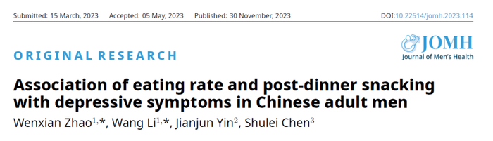 此前,在《男性健康期刊》上的一篇名为“Association of eating rate and post-dinner snacking with depressive symptoms in Chinese adult men” 的研究发现:中国成年男性的吃饭速度和抑郁症状之间竟存在显著关联!