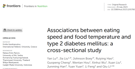 2. Lu Y, Liu J, Boey J, Hao R, Cheng G, Hou W, Wu X, Liu X, Han J, Yuan Y, Feng L and Li Q (2023) Associations between eating speed and food temperature and type 2 diabetes mellitus: a cross-sectional study. Front. Nutr. 10:1205780. doi: 10.3389/fnut.2023.1205780