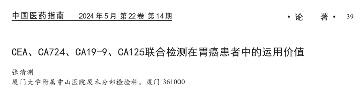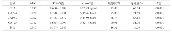 研究表明,血清CA72-4联合CEA、CA19-9、CA125诊断胃癌的AUC大于各指标单独诊断,灵敏度、特异度分别为86.36%、84.09%,表明血清CA72-4、CEA、CA19-9、CA125 联合可提高胃癌诊断价值。