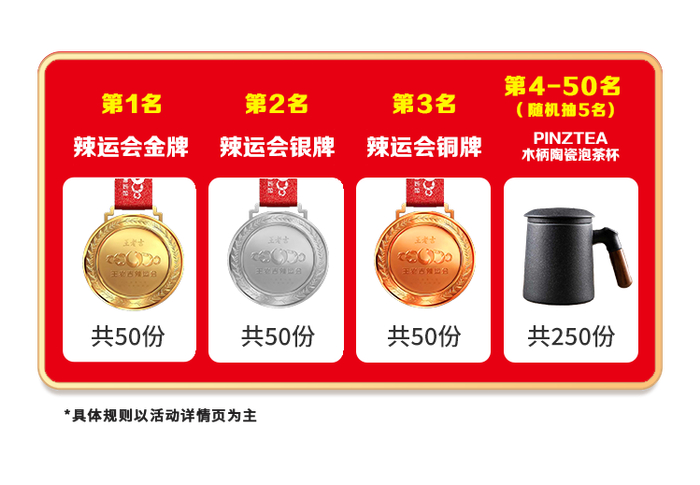 每周完成游戏通关挑战,还可自动参与王老吉辣运会挑战榜排名,累计挑战成功次数前3名皆可获得奖牌,每周排行榜第1名可获得辣运会金牌,第2-3名可分别获得辣运会银牌和铜牌奖牌。每周还从排名第4-50名的用户中,随机抽出5名,可获得PINZTEA木柄陶瓷泡茶杯。