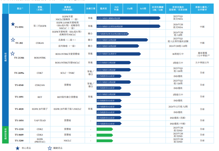 自2017年成立以来,同源康医药已建立由11款候选药物组成的管线,包括处于3期关键临床阶段的核心产品TY-9591(第三代EGFR-TKI)、其他6款临床阶段产品及4款临床前阶段产品。该公司还计划通过内部努力并且与外部合作伙伴的合作来建立销售及营销能力,以确保在中国成功商业化该产品。以下将介绍同源康医药主要的在研管线: