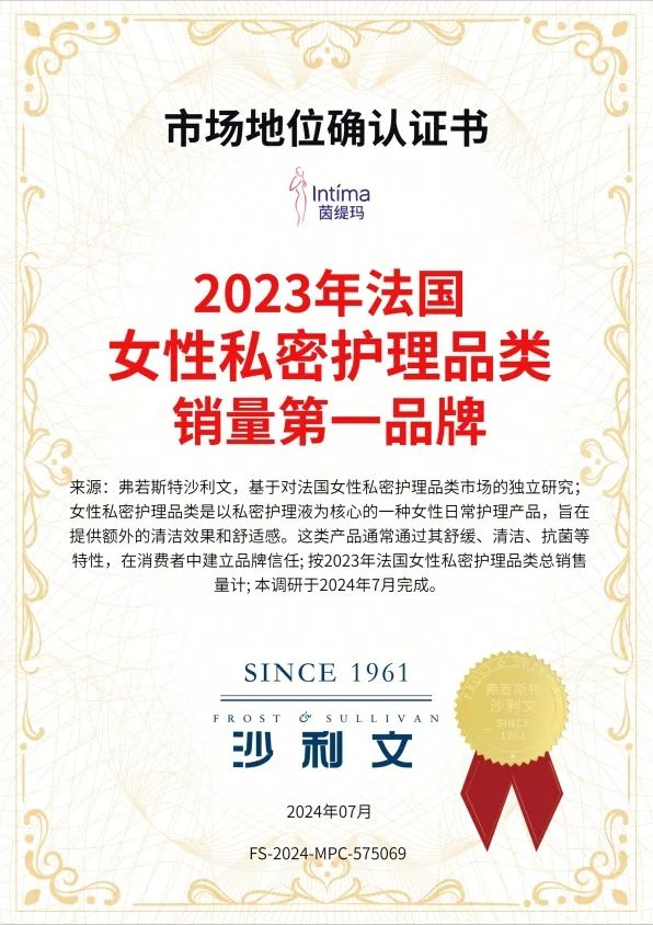 2024年7月Intima茵缇玛获沙利文颁发的“2023年法国女性私密护理品类销量第一品牌”。 历经30多年时间的考验,Intima茵缇玛畅销法国、德国、比利时等多个国家,深耕女性私密护理行业,提供高质量私密清洁产品,得到广泛消费者的认可。