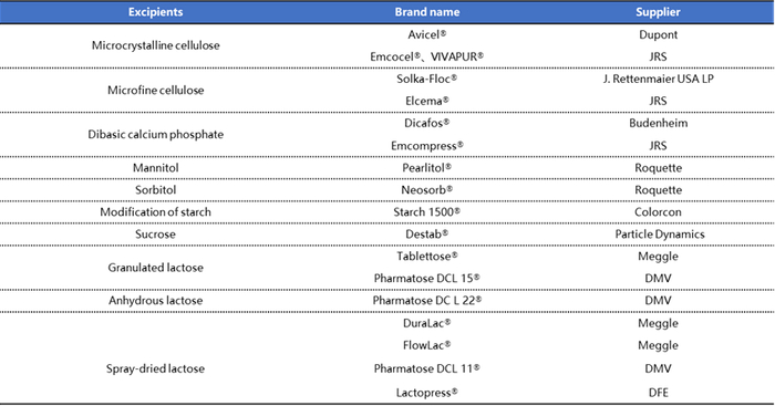 为了保证压片过程的顺利进行,直压粉末应具有较好的流动性和可压性,但多数药物不具备这些特点,需要在粉末直压处方中加入适宜的填充剂来改善API性质。因此粉末直压工艺中辅料的选择是至关重要的,辅料应具有良好的流动性和可压性,以及适宜的堆密度和较大的药品容纳量(即加入较多的药品而不至于对其流动性和可压性产生明显的不良影响)。表 2列举了部分常用于粉末直压的填充剂及其供应商。