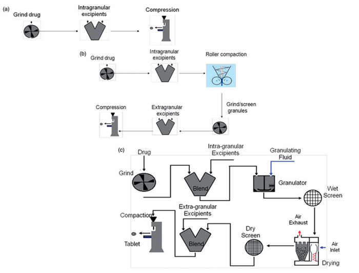 根据生产工艺的不同,药物科学学术会议在2013年5月提出了生产工艺分类系统(Manufacturing Classification System, MCS),分为(1)直压工艺(2)干法制粒(3)湿法制粒(4)其他工艺。如图 1所示,最简单的直压工艺属于第1类,依次为2类的干法制粒和3类的湿法制粒,从第1类到第3类,工艺步骤、操作复杂性和生产成本均逐渐增加。工艺越复杂,相应地API受到的影响因素就越多,比如干法制粒和整粒过程中的剪切力,湿法制粒过程中暴露在高湿度环境内,以及干燥和包衣过程中的加热导致温度升高等,这些因素均可能会导致API的某些理化性质发生变化,从而出现偏离预期的情况,而且多步骤工艺会使问题比较难溯源。第4类包含了更为复杂的制剂工艺,如熔融制粒、喷雾干燥等。
