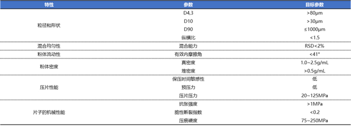 粉末直压工艺主要包含混合、压片两个步骤,即将药物粉末与适宜辅料分别过筛并混合均匀后,不经过制粒直接压制成片,在操作上省工省时,具有明显的经济优势。在对粉末直压进行处方设计时,需要考虑到API的性质如粒子形状和粒径分布,辅料的流动性、可压性和润滑性,物料的混合均匀性及生产的可操作性,关键在于API的性质和占比以及适宜的辅料种类和用量。Hancock提出理想的粉末直压材料应具有如下性质,如表 1所示。