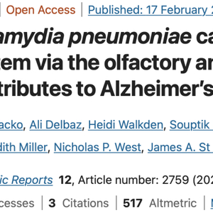 Chacko, A., Delbaz, A., Walkden, H. et al. Chlamydia pneumoniae can infect the central nervous system via the olfactory and trigeminal nerves and contributes to Alzheimer’s disease risk. Sci Rep 12, 2759 (2022). https://doi.org/10.1038/s41598-022-06749-9
