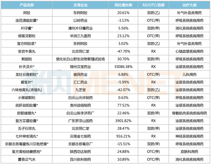 值得一提的是,中成药TOP20产品中,呼吸系统疾病用药和泌尿系统疾病用药等类别在数量上占优,分别有6个和5个产品上榜;有14个为OTC或双跨产品,合计占比达七成;有11个产品销售额增速均达两位数及以上,其中补天灵片、复方苁蓉胶囊、七叶神安滴丸等同比增幅超900%,产品潜力可期。