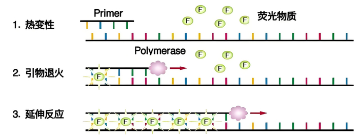 在PCR反应体系中,加入过量SYBR荧光染料,SYBR荧光染料特异性地掺入DNA双链后,发射荧光信号,而不掺入链中的SYBR染料分子不会发射任何荧光信号,从而保证荧光信号的增加与PCR产物的增加完全同步。
