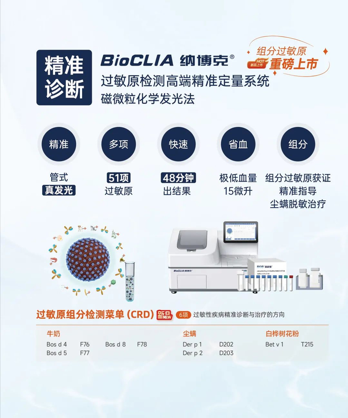 全新重磅上市的纳博克®组分过敏原检测产品,纳米磁微粒化学发光平台可检测过敏原项目多达51项,革新技术真正致力于精准诊断,为发展过敏专科保驾护航;