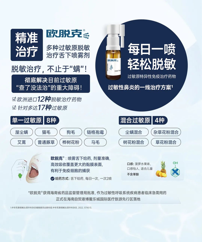 欧脱克®脱敏治疗舌下喷雾剂,欧洲进口12种脱敏治疗药物针对多达17种过敏原,彻底解决目前过敏原“查了没法治”的重大障碍,真正惠及广大过敏患者。