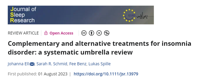 2. Ell J, Schmid SR, Benz F, Spille L. Complementary and alternative treatments for insomnia disorder: a systematic umbrella review. J Sleep Res. 2023 Dec;32(6):e13979. doi: 10.1111/jsr.13979.