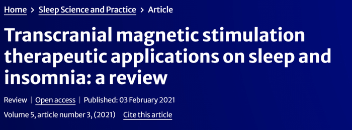 3. Oroz, R., Kung, S., Croarkin, P.E. et al. Transcranial magnetic stimulation therapeutic applications on sleep and insomnia: a review. Sleep Science Practice 5, 3 (2021). https://doi.org/10.1186/s41606-020-00057-9