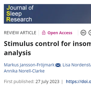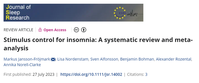 1. Jansson-Fröjmark M, Nordenstam L, Alfonsson S, Bohman B, Rozental A, Norell-Clarke A. Stimulus control for insomnia: A systematic review and meta-analysis. J Sleep Res. 2024 Feb;33(1):e14002. doi: 10.1111/jsr.14002.
