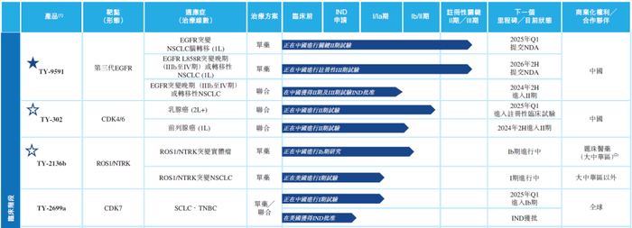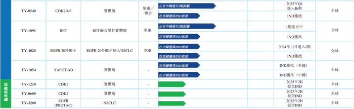 TY-0540:一种选择性CDK2/4/6抑制剂,拟用于治疗晚期╱转移性实体瘤。在对小鼠模型进行的临床前研究中,该产品在高达40mg/kg(BID)表现出优异的耐受性及于此剂量水平表现出对乳腺癌和胰腺癌的初步疗效。