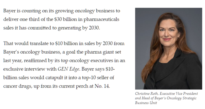 去年2月,拜耳执行副总裁兼肿瘤学战略业务部负责人Christine Roth在一次采访中表示:拜耳集团正寄望于其蓬勃发展的肿瘤业务板块,以实现其雄心勃勃的财务目标——到2030年,该业务部门的销售额预计将达到100亿美元,占其承诺的300亿美元药品总销售额的三分之一。同时,她表示100亿美元的销售额将使拜耳从当前全球抗癌药物销售的第14位跃进至前10强。