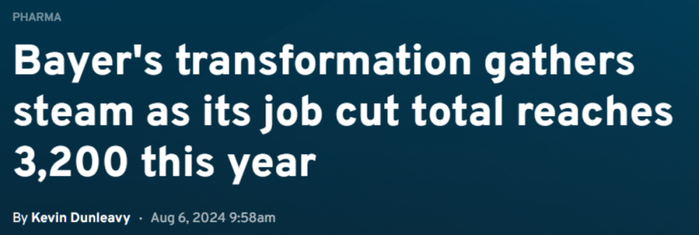 近日,拜耳公布2024第二季度财报,更新了其正在进行的裁员计划,称其在2024年上半年裁员超过3000人,主要是管理职位,这一数字不仅标志着拜耳转型的加速,也引发了业界对其未来发展的广泛讨论。