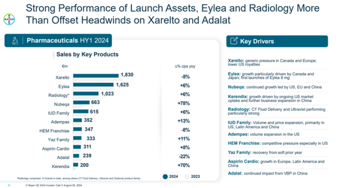 拜耳的业务版图由三大支柱构成:处方药、健康消费品和作物科学。在2024年上半年,处方药业务营收达到89.63亿欧元,同比增长4.2%,其中第二季度单季营收46.05亿欧元,同比增长4.5%。这一增长得益于包括Nubeqa(达罗他胺)、Kerendia(非奈利酮)、Eylea(阿柏西普)在内的主要产品线和放射业务的持续增长。
