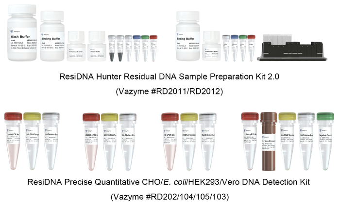 ResiDNA Precise系列试剂盒采用探针法定量检测宿主细胞残留DNA,现推出针对CHO、E. coli、HEK293、Vero宿主检测试剂盒(Vazyme #RD202/104/105/103),以及样本前处理试剂盒ResiDNA Hunter Residual DNA Sample Preparation Kit 2.0(Vazyme #RD2011/RD2012),可实现生物制品及药品中间品、半成品和成品中宿主细胞残留DNA稳定、准确、快速的飞克(fg)级定量检测。