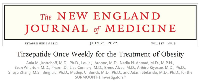 SURMOUNT-1是一项多中心、随机、双盲、安慰剂对照的3期临床试验,旨在评估不同剂量(5mg、10 mg和15 mg)的tirzepatide作为低热量饮食的辅助治疗手段的疗效和安全性。这次公布的分析结果,包含1032名患有糖尿病前期的肥胖或超重成年人,这些受试者随机分组接受安慰剂与不同剂量tirzepatide的治疗,治疗期为176周,接续17周的停药期(共计193周)。SURMOUNT-1试验包含所有受试者的72周初步分析结果曾发表于2022年的《新英格兰医学杂志》上。