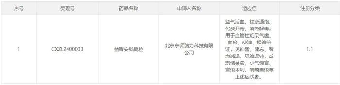 京师脑力的中药1.1类新药益智安脑颗粒用于治疗血管性痴呆,该产品的临床申请于2024年6月14日获得CDE承办受理,8月20日获得临床试验默示许可。