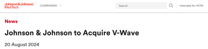 8月20日,强生公司宣布,已达成收购V-Wave Ltd.的最终协议。根据协议条款,强生公司将以6亿美元的预付款收购V-Wave,并根据惯例进行调整,此外还有可能支付高达11亿美元的额外监管和商业里程碑付款(折合人民币共计约121亿元)。该交易预计将在2024年底前完成,但须获得适用的监管机构批准和其他惯例成交条件。