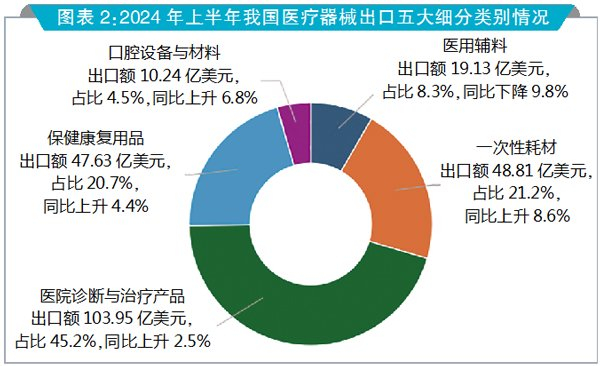 2024年上半年,我国医疗器械出口在历经前几年疫情带来的大幅波动后,企稳并回暖,恢复了常态化的增长趋势。根据海关统计数据,2024年上半年,我国医疗器械出口总额为229.76亿美元,同比增长3.1%。