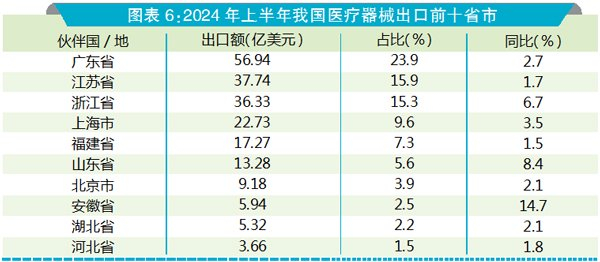 2024年上半年,我国医疗器械出口额前十省市累计占比达87.6%。前十省市的出口额均不同程度上涨。其中,涨幅最高的为安徽省,同比增长14.7%。