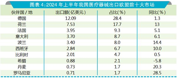 欧盟 上半年,我国医疗器械对欧盟27国出口额为42.6亿美元,同比增长6.6%。对欧盟出口前十大市场中,除了对希腊出口同比下滑5.8%外,对德国、荷兰、法国、意大利等其他九大欧盟市场出口同比均呈现不同程度增长。