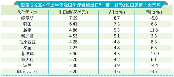 “一带一路”沿线国家 上半年,我国医疗器械对“一带一路”沿线152个国家累计出口额为88.2亿美元,同比增长了4.3%。其中,俄罗斯依旧占据首位,出口额为7.69亿美元,但受货币结算不畅影响,同比下降了5.8%;韩国、越南、新加坡、马来西亚分别位列第2~5位,出口呈现较好增长。此外,对委内瑞拉、伊拉克、吉尔吉斯斯坦、阿联酋等市场出口增幅显著。