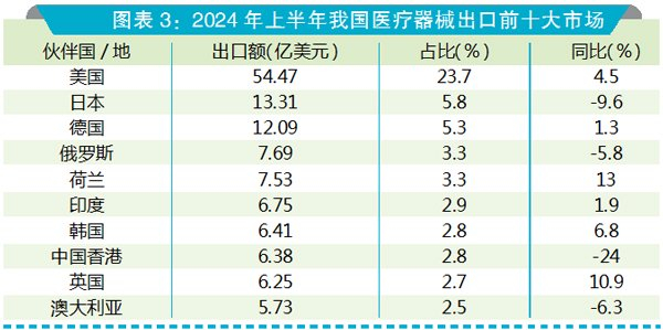 上半年,我国医疗器械对前十大市场的出口额合计为126.61亿美元,占整体出口额的55.1%。其中,荷兰和英国市场表现亮眼,出口额同比分别增长13%和10.9%。